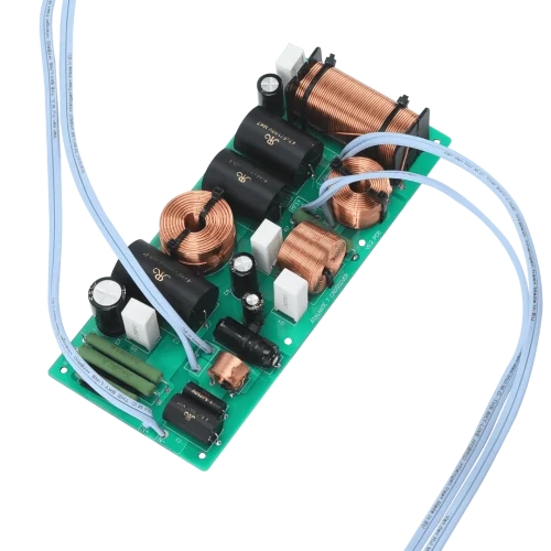 Custom-designed multi-element crossover network utilizing premium iron core inductors and mylar capacitors.
