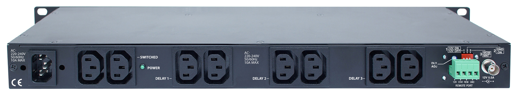 Rear Panel Outlets: 2 Switched IEC C-13 (1 duplex), 6 Sequenced IEC C-13 (3 duplexes each controlled by separate relay)