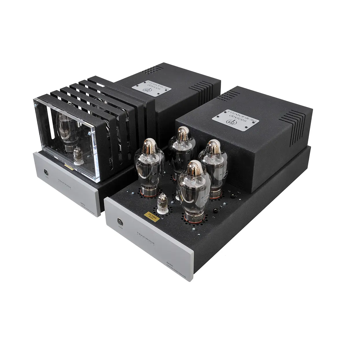 It’s design is a double push-pull implementing 4 power tubes per monoblock.